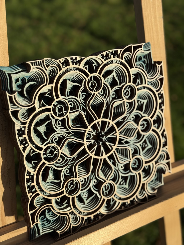 - Technique : Découpe laser multicouche, colorisation acrylique manuelle, assemblage artisanal.