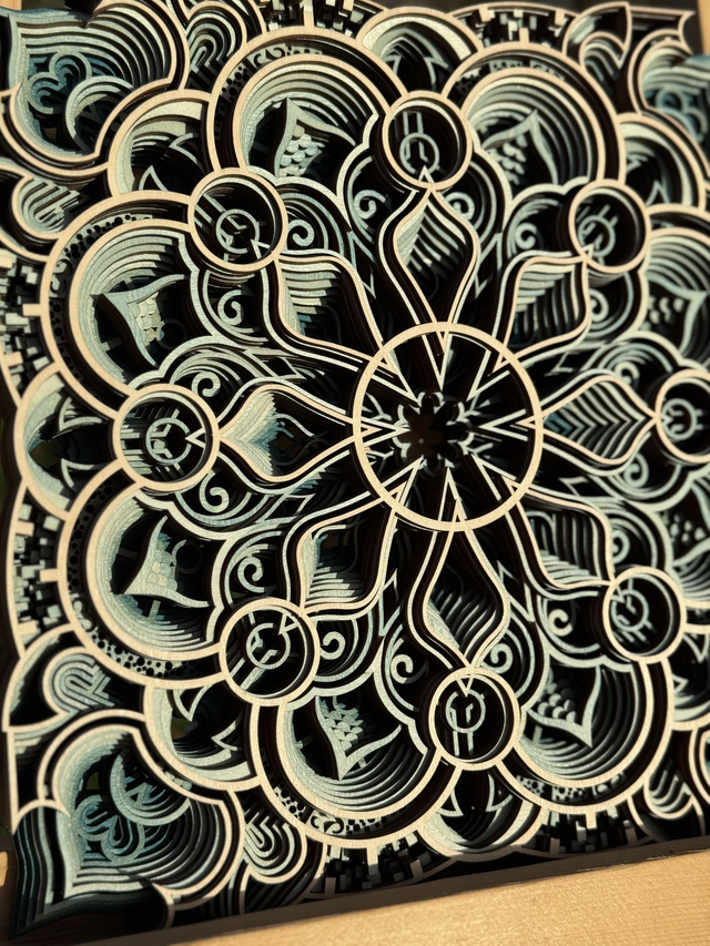 - Superposition de couches de bois découpées et colorée une à une.